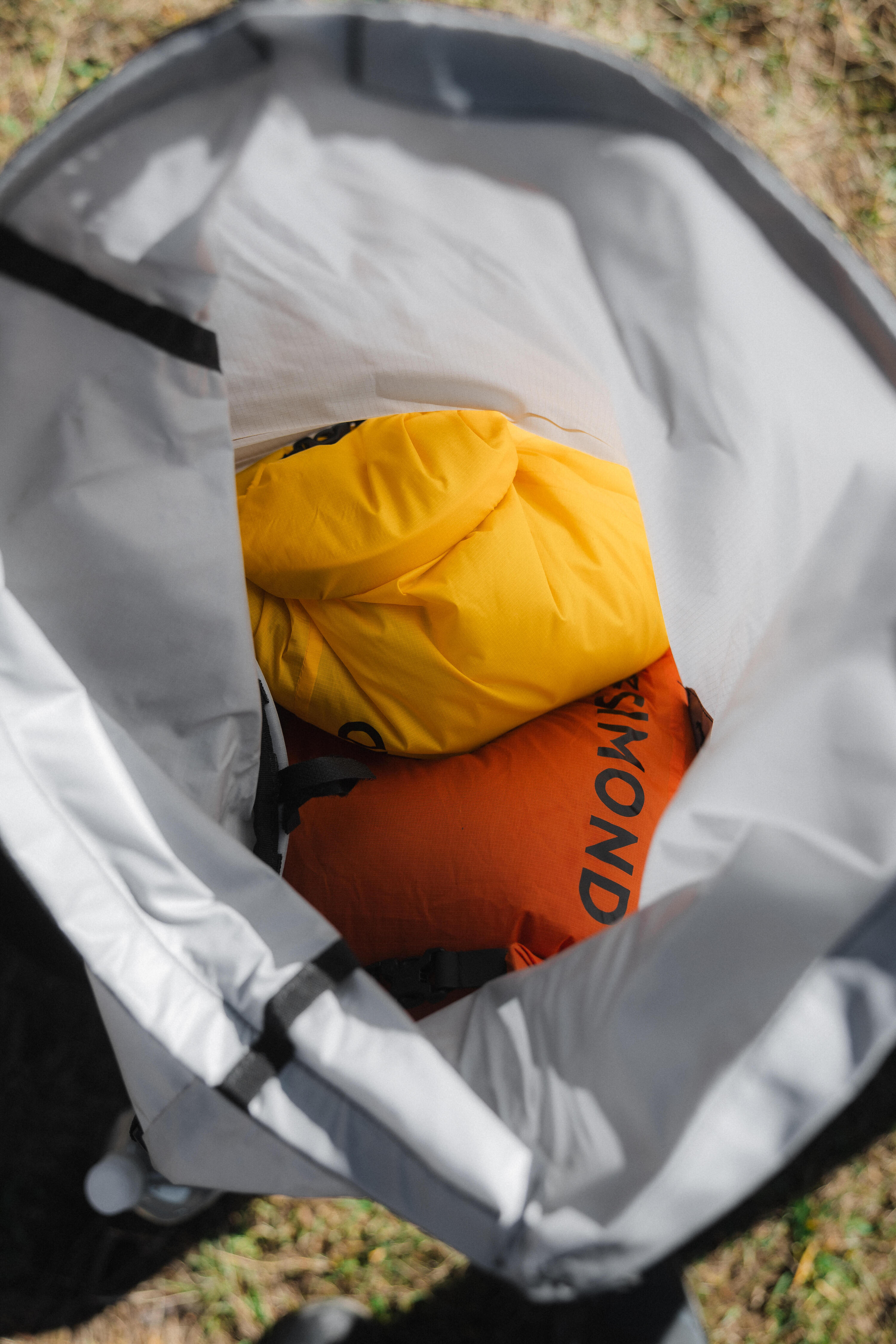 - En gardant cette housse ouverte dans le sac, faites rentrer votre sac de couchage suivi de votre tente et de votre matelas.